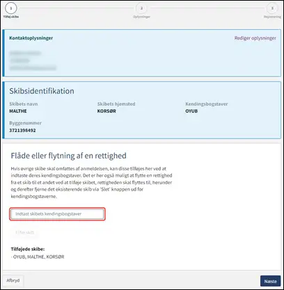 Den eksisterende kreditors nationalitet skal udfyldes, hvis nationaliteten er Dansk skal e-mail og adresse udfyldes, medmindre der sættes hak ud for: ”Jeg vedlægger fuldmagt, da det ikke er muligt at invitere til digital signering. Bemærk, at hvis du vedlægger en papirfuldmagt, skal dokumentationen til godkendelse hos Skibsregistret.”.