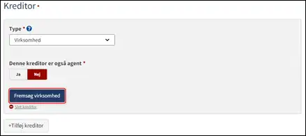 Det kræves at der oplyses kreditorens type, dette gøres ved at klikke på menuen under ”Type”, og herefter vælge enten ”Virksomhed” eller ”Person”. Derudover skal det oplyses hvorvidt kreditor også er agent, dette gøres ved at vælge ”Ja” eller ”Nej” under ”Denne type er også agent”