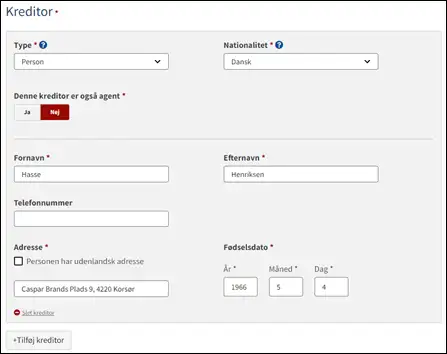 Hvis kreditoren er dansk, skal fornavn, efternavn, adresse, e-mail og fødselsdato udfyldes.