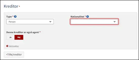 Hvis kreditoren er en person, skal nationalitet oplyses, dette gøres ved at klikke på menuen under ”Nationalitet” og dernæst vælge ”Dansk” eller ”Ikke-dansk”
