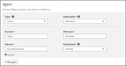 Hvis agenten er ikke-dansk, skal fornavn, efternavn, adresse og bopælsland udfyldes.