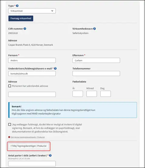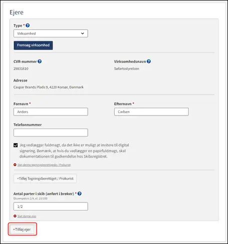 Trin 3: Ejerforhold for optagelse af skib: Tilføj tegningsberettiget / Prokurist
