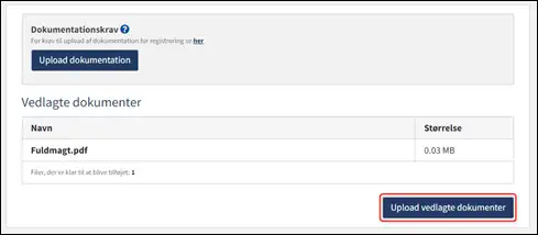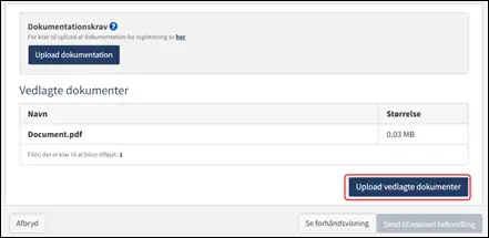 Systemet viser listen over dokumenter, der ønskes vedlagt anmeldelsen. Klik på ”Upload vedlagte dokumenter”.