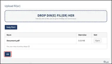 Når alle filer, der ønskes uploadet, er tilføjet til listen, klik på ”OK”.